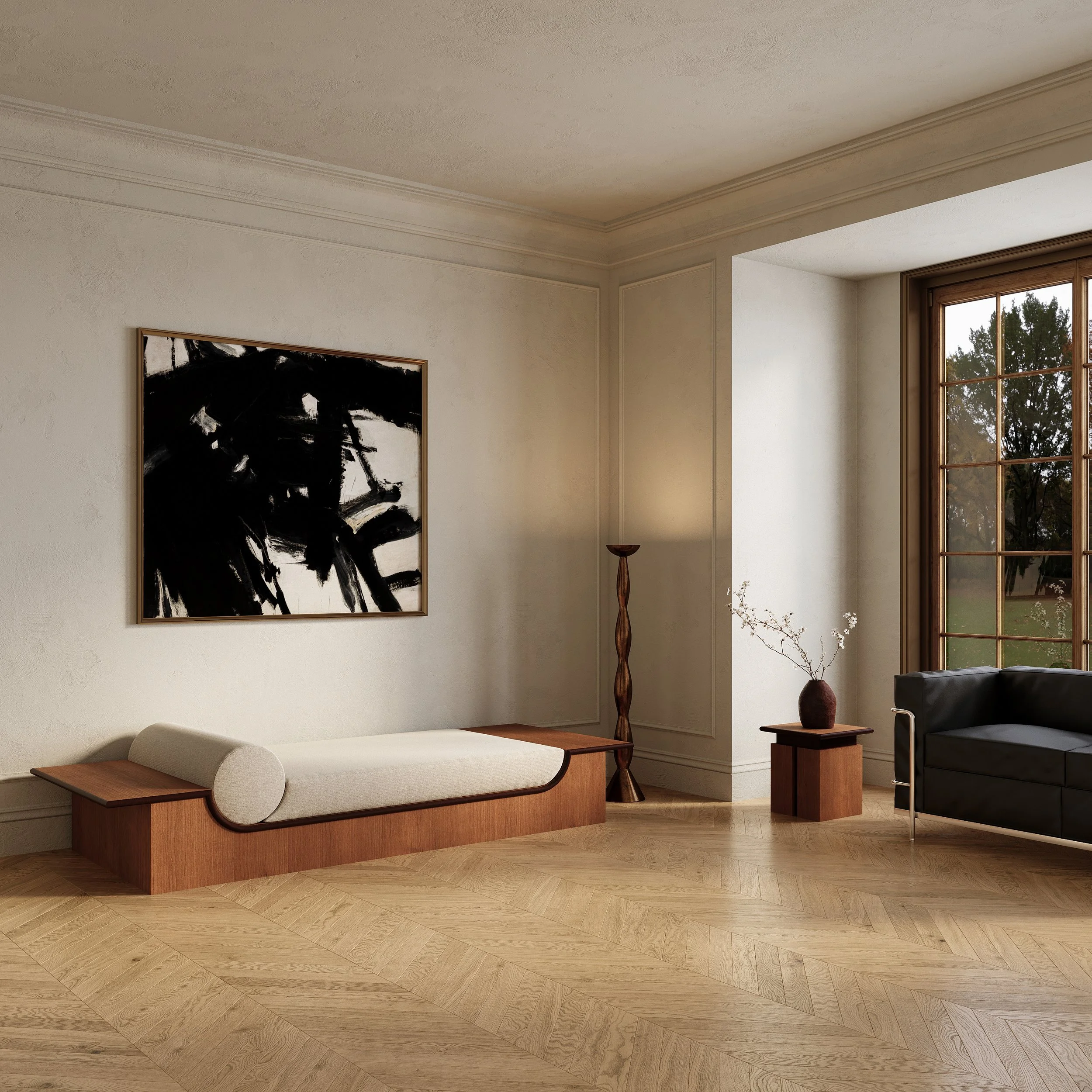 Rooted in stillness, the Grounded Daybed was designed to hold weight; visually and emotionally, while maintaining a sense of ease. Its low, monolithic frame anchors the space, while subtle proportions and clean lines create an unexpected lightness. Bold but restrained, it reflects a personal design language: heavy gestures softened by intention.